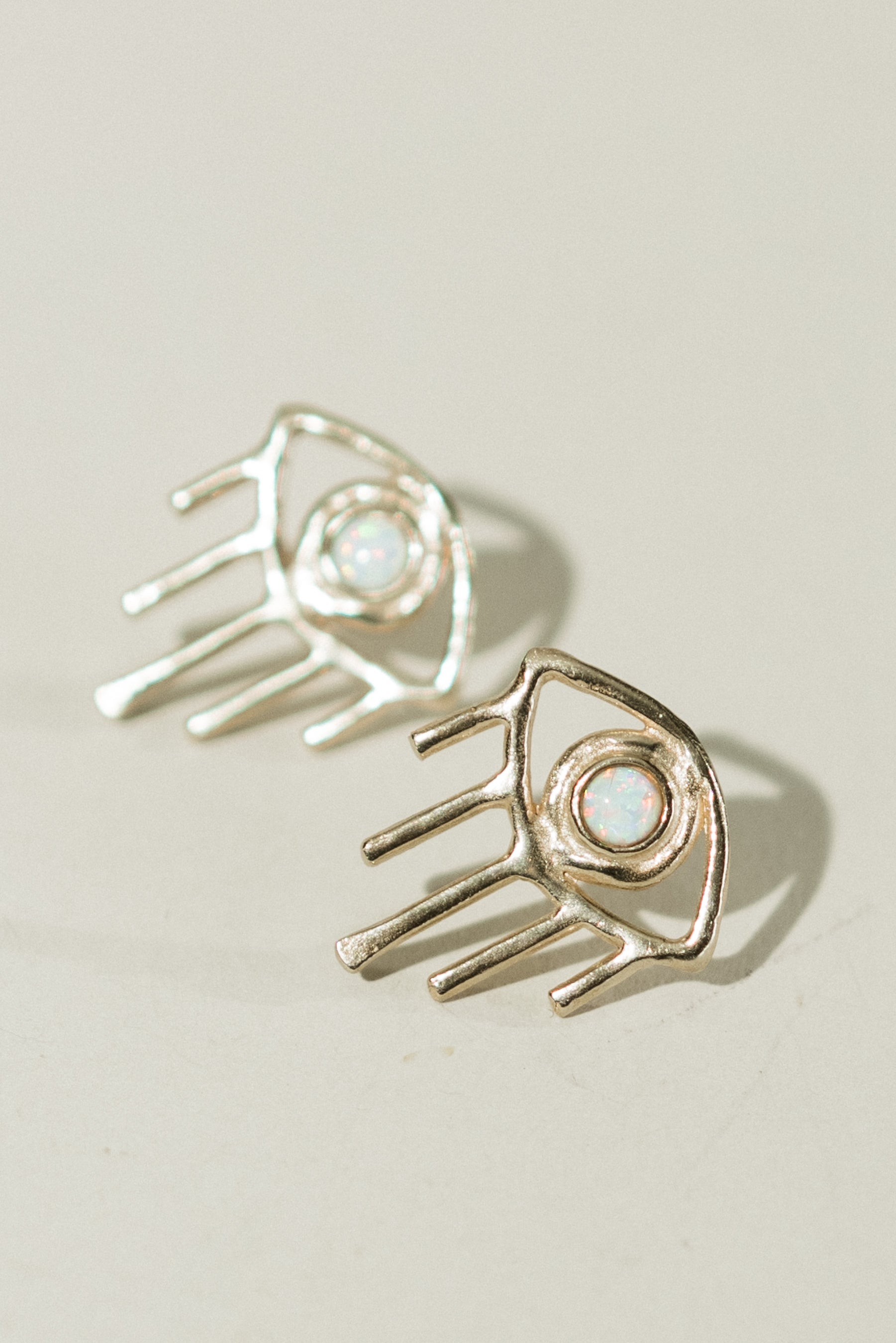 These unique earrings were handmade using the lost wax casting process. The design was sculpted in wax, cast in brass, and set with rainbow moonstone.