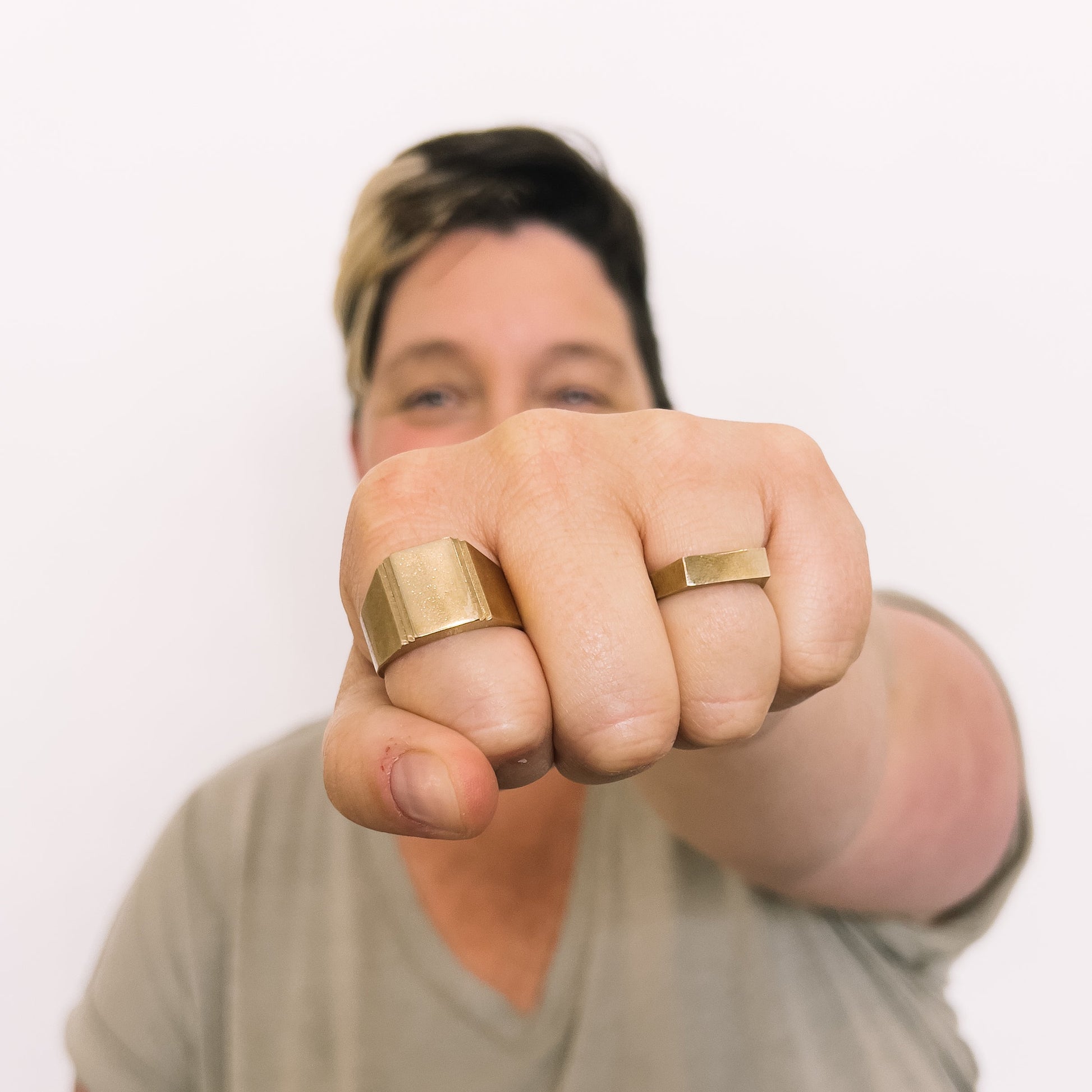 A solid cast ring with textured shank and polished top. Designed by Betsy & Iya and handcrafted in the studio attached to their Portland shop.
