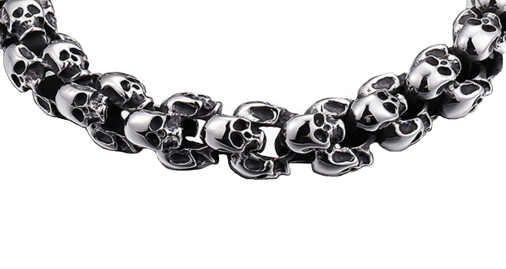 - BOLD DESIGN: This is a very cool 26" necklace with 232 highly detailed skulls linked together on 57 individual skull embellished links to make a very cool handcrafted stainless steel chain link necklace. The high polished vintage styling wears well whether your look is punk, goth, rock, biker or just your favorite t-shirt. This necklace definitely has a multi-generational appeal.