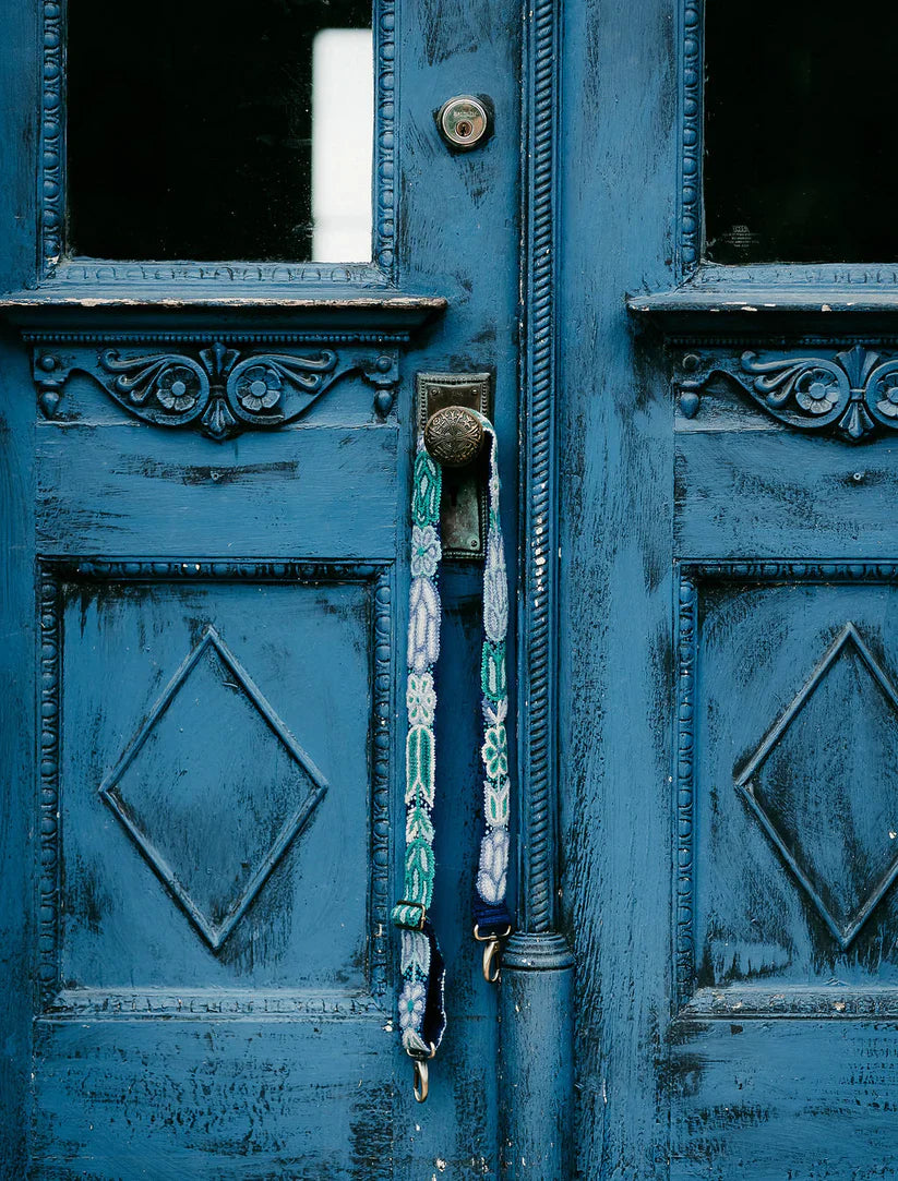 A perfect combination of blues and greens on this hand embroidered adjustable strap. Hand embroidered by Fair Trade artisans in the Andes mountains of Peru.