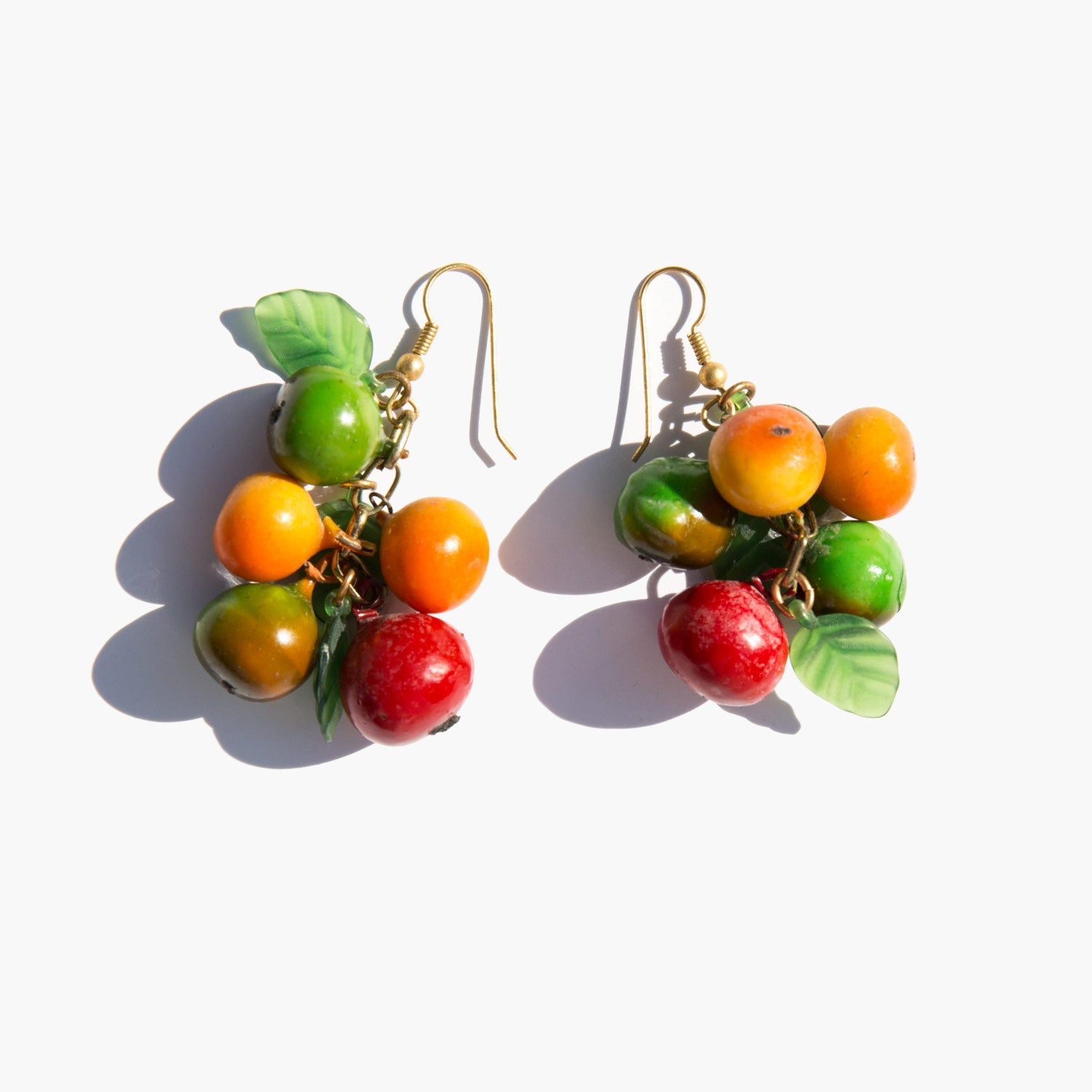 Vintage earrings with 14k gold posts and a cluster of colorful plastic fruits and leaves.