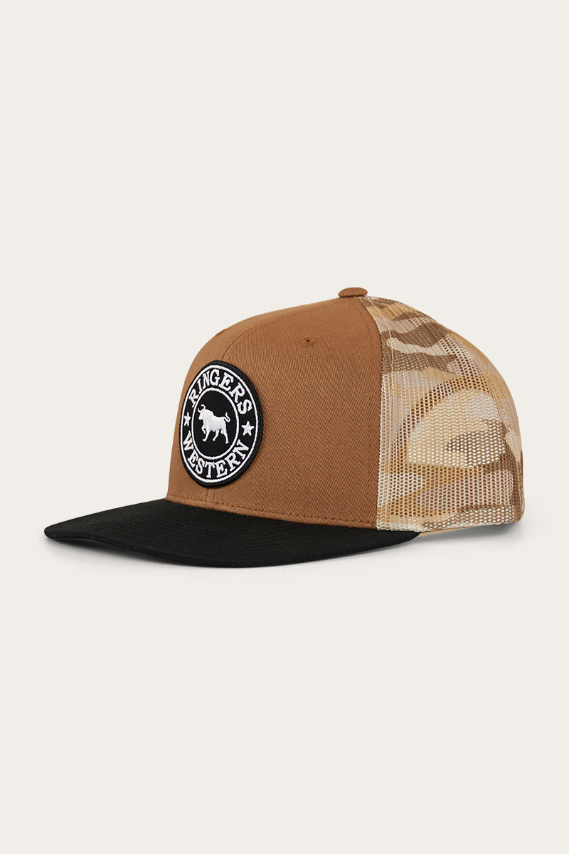 Our Ringers Western trucker caps represent the heart and soul of everything we stand for. This cap has a premium-quality mesh back and metal eyelets for optimal ventilation, ensuring all-day comfort on sun-soaked days. The structured front panel proudly displays a Ringers Western logo, symbolising spirit and tradition. The Dalby is a flat-brim style offering reliable protection and making ideal leisure wear. The classic snap-back closure offers an adjustable fit for most head sizes. Whether you’re out travelling the open road, attending a local festival or just representing the brand, our trucker caps have you covered.