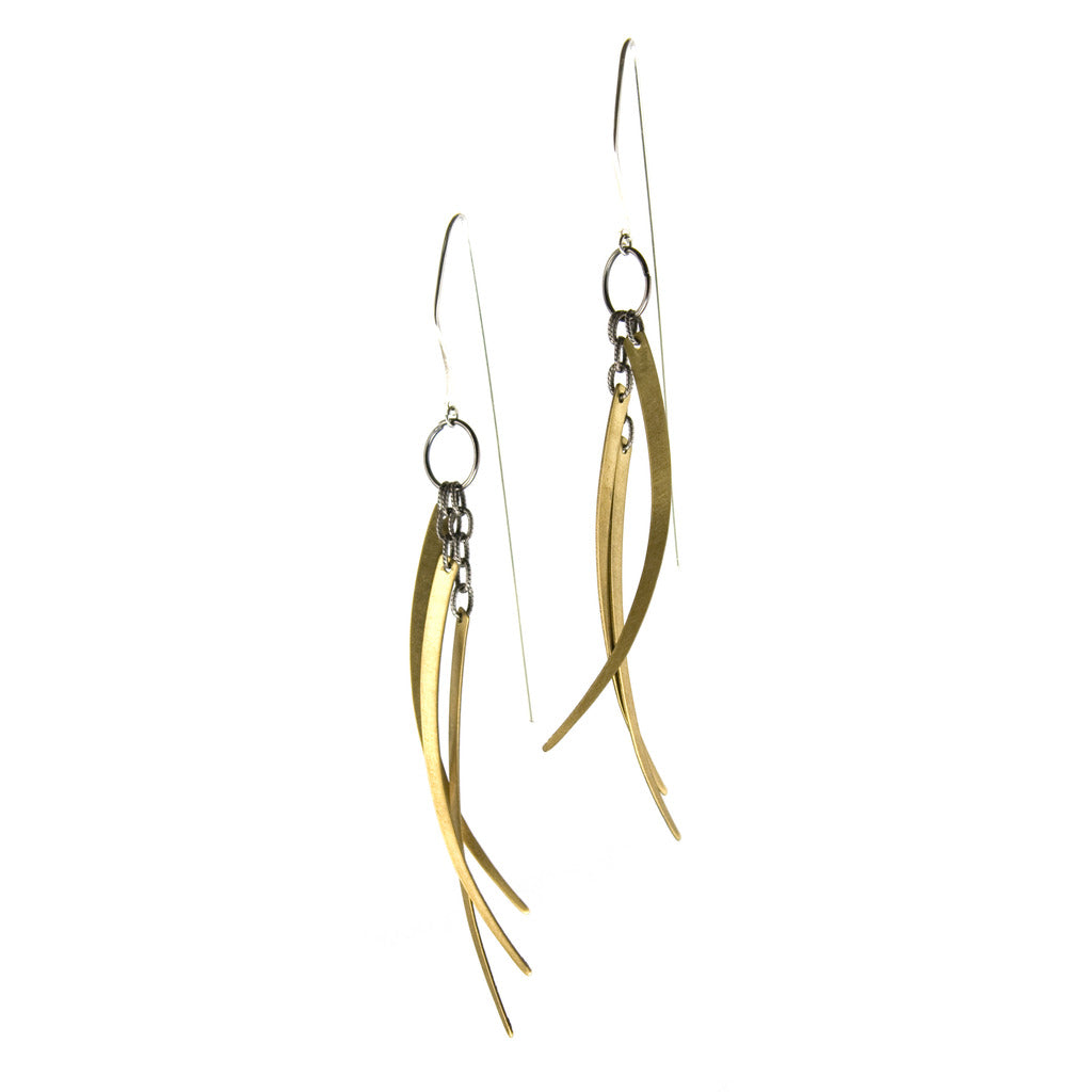 Materials: Three curved brass spikes with base metal chain on hand-formed sterling silver-filled ear wires.