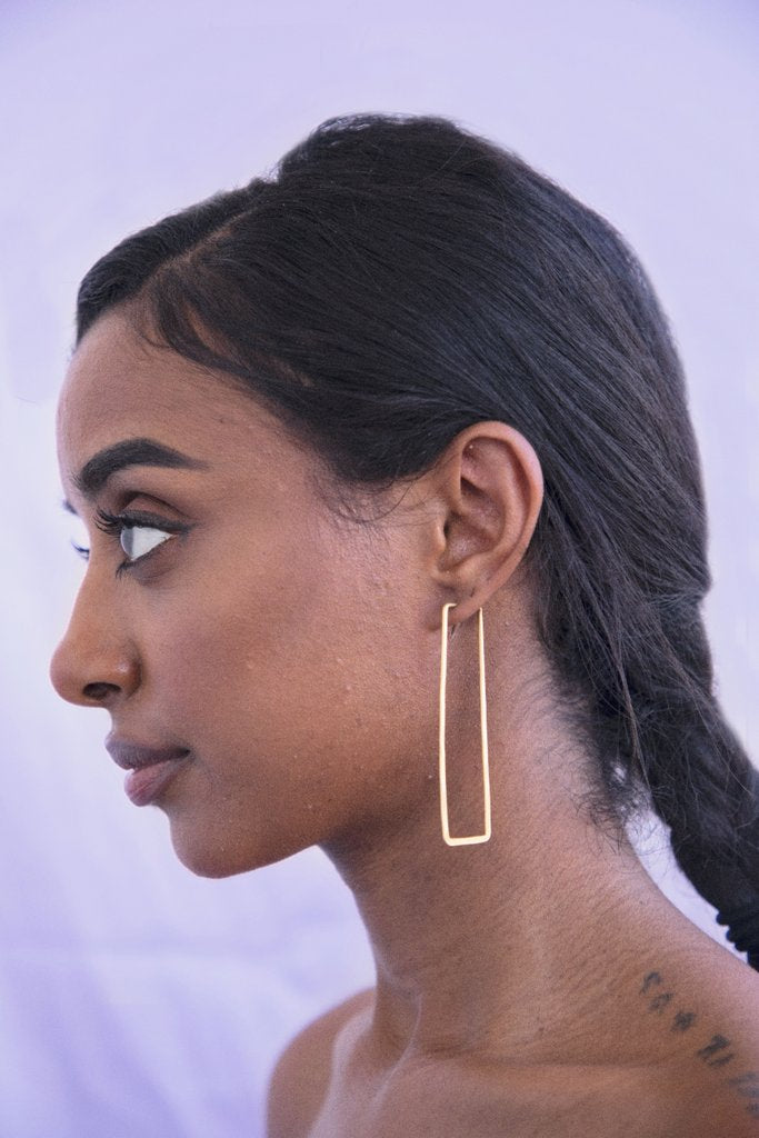 Each pair is hand forged in brass, leaving a reflective, hammered texture. All Geo Hoop styles are very lightweight, making them comfortable, everyday pieces, no matter what size.