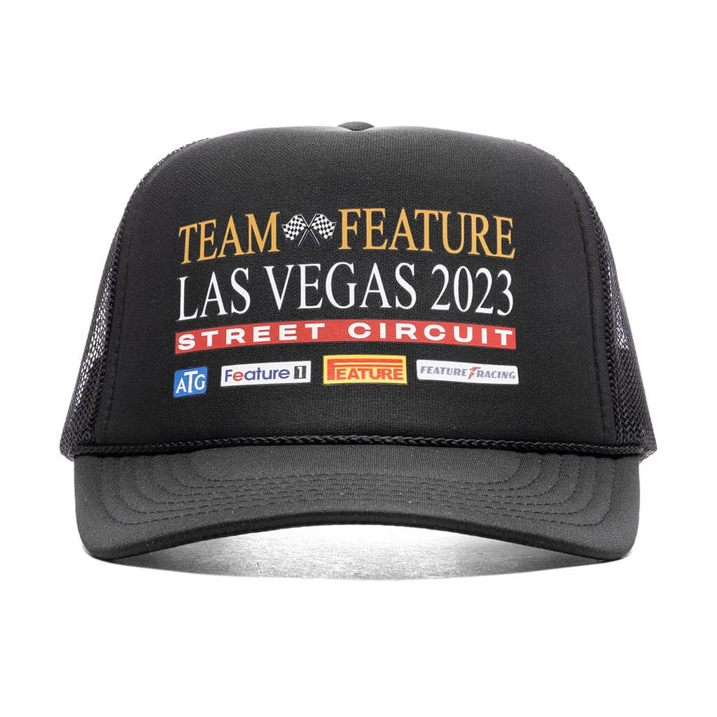 The Street Circuit Trucker from the FEATURE ‘Las Vegas Grand Prix’ collection is constructed from a structured foam material on the front panel, while mesh panels decorate the remainder of the hat. Screen-printed graphics are placed on the front, showcasing motorsport-inspired iconography and FEATURE branding. The design is completed with a curved brim and a snapback closure.