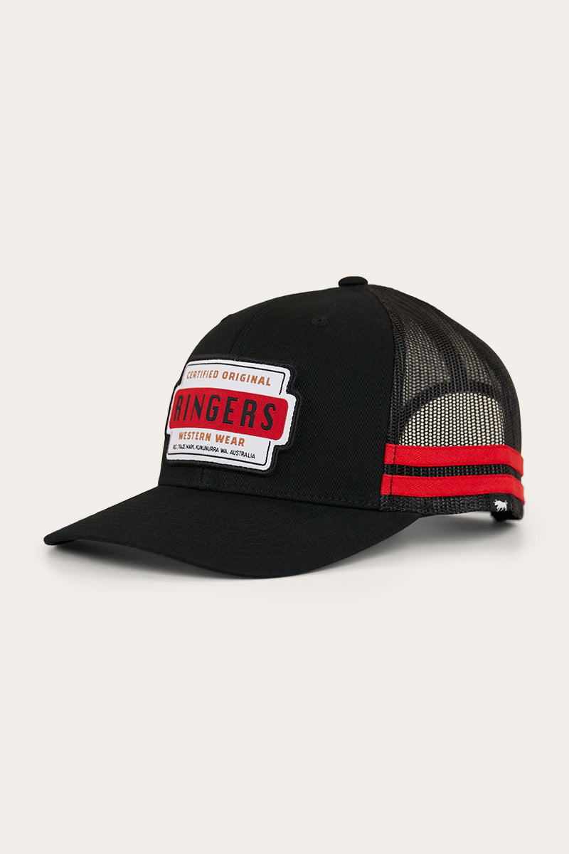 Our Ringers Western trucker caps represent the heart and soul of everything we stand for. This cap has a premium-quality mesh back and metal eyelets for optimal ventilation, ensuring all-day comfort on sun-soaked days. The structured front panel proudly displays a Ringers Western logo, symbolising spirit and tradition. The classic snap-back closure offers an adjustable fit for most head sizes. Whether you’re out travelling the open road, attending a local festival or just representing the brand, our trucker caps have you covered.