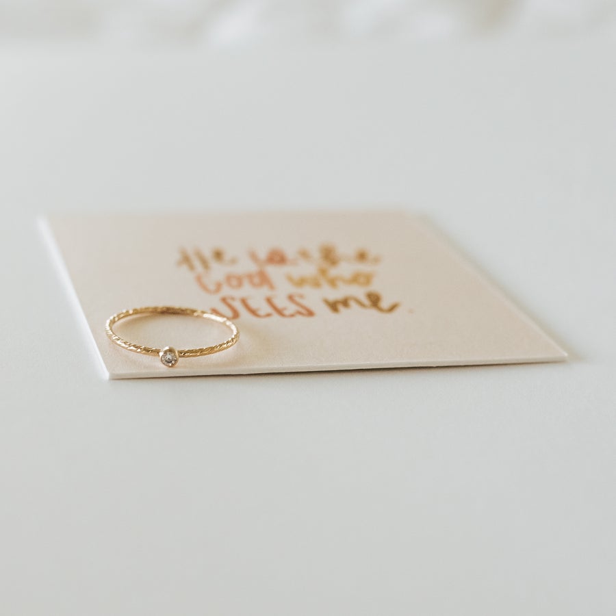 We hope that every time you wear one of these rings that you are reminded of the sweet promise it represents, and we pray that it opens up opportunities to share that promise with others. We chose a textured ring with a shining stone to represent God knowing our inner most being, all parts good and bad, and still loving and shining through us.
