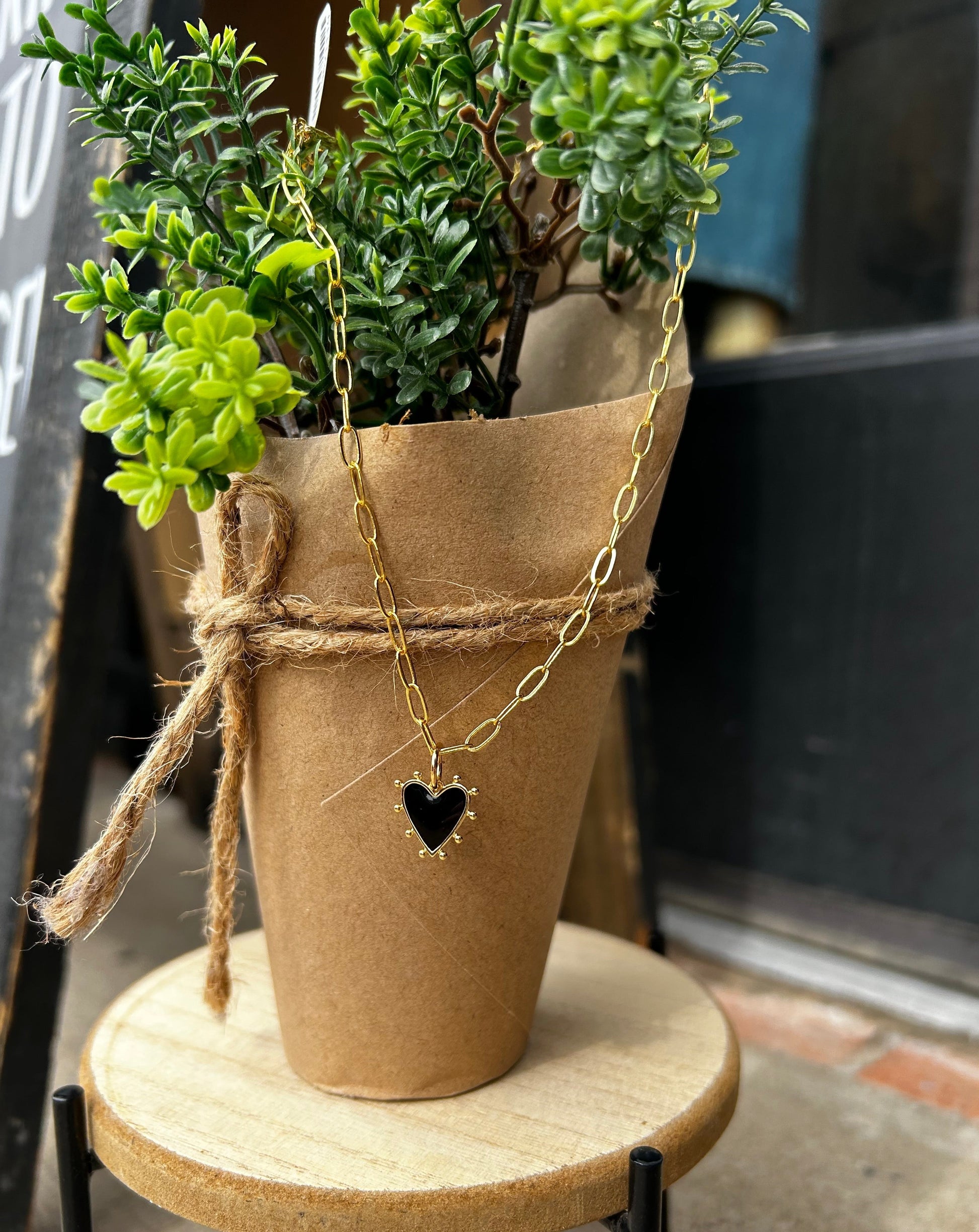 16" necklace with a black heart and gold dot detail, featuring a mini paperclip chain available in custom lengths.