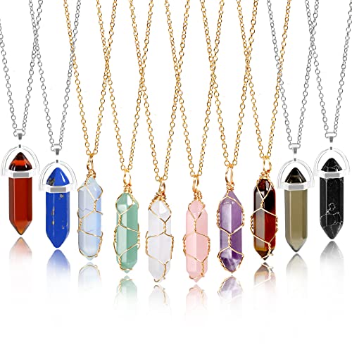 - 💎Package Include💎 The 6 colors of Pendant Necklaces with tree wire wrapped are amethyst, pink crystal, white crystal, aventurine, tiger's eye, Opal; the 4 colors of the alloy ring are black turquoise, tawny stone, lapis lazuli, brown, caffeic stone. All the crystal necklace set consists of 10 pieces of natural hexagonal quartz pendants with necklace chain. Each of them is individual package with bags and a small plastic box is for storage.