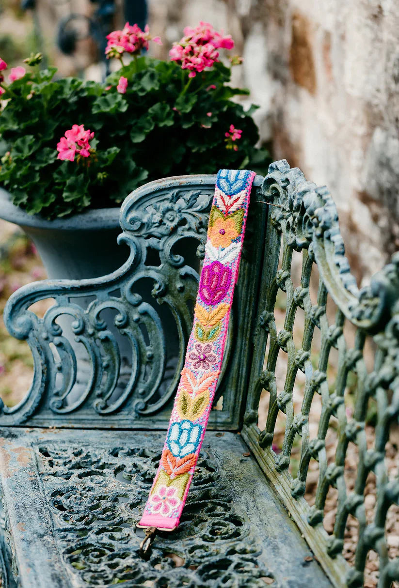 Hand loomed hot pink wool fabric with bright floral and leaves design. Non-adjustable. Hand embroidered by Fair Trade artisans in the Andes mountains of Peru.