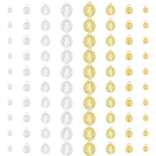 - BEAD CAGE: 80 Pieces spiral bead cages pendants in silver and gold color. Four size: 8x9mm, 14x15mm, 20x25mm, 25x30mm (including the top loop). Each size has 10 pieces spiral bead cage pendants in silver color. Each size has 10 pieces spiral bead cage pendants in gold color.