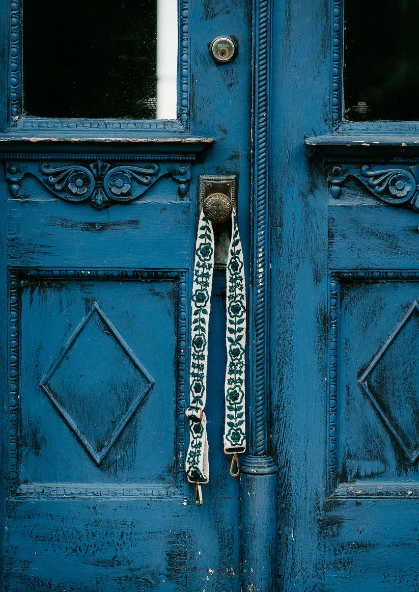 Jill is the perfect strap to show your school pride! Light cream fabric with green floral and leaves design. All hand embroidered. Looks great under Friday night lights or at the tailgate on Saturday.