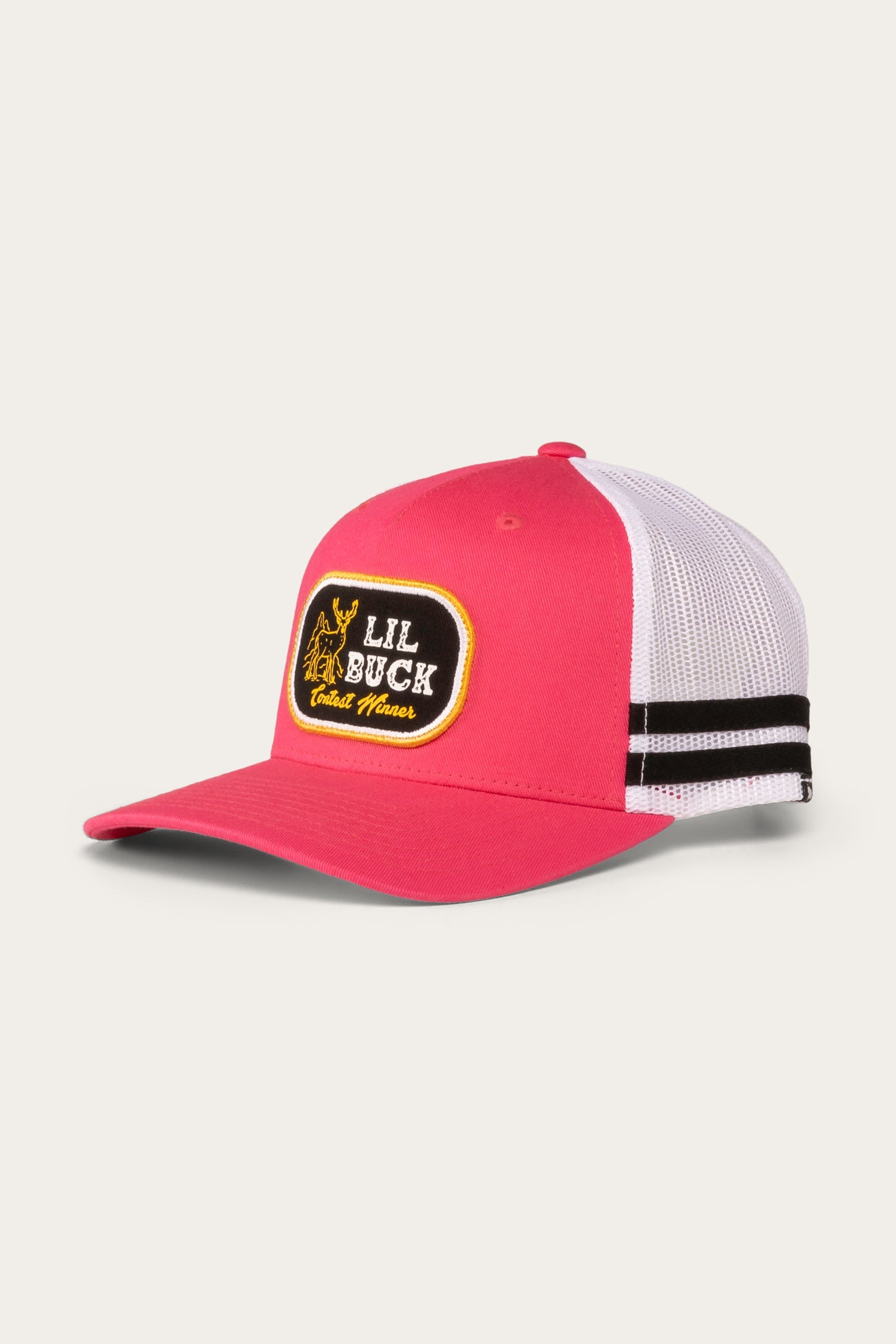 The Lil Buck trucker cap features a large print & embroidered art patch. Twin stripes around the mesh panelling side and a matching coloured plastic snap closure.