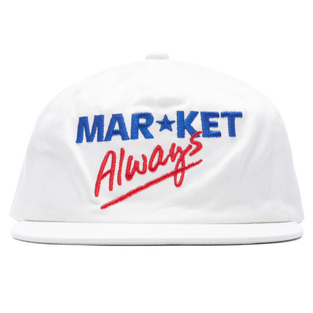 Market’s Low Prices 5 Panel Hat is a must-have headwear silhouette. Taking on a cotton construction, the hat features a flat brim paired with an adjustable rear closure. Woven eyelets reside on the crown, while the embroidered branding at the face paired with embroidered phrasing completes the look.