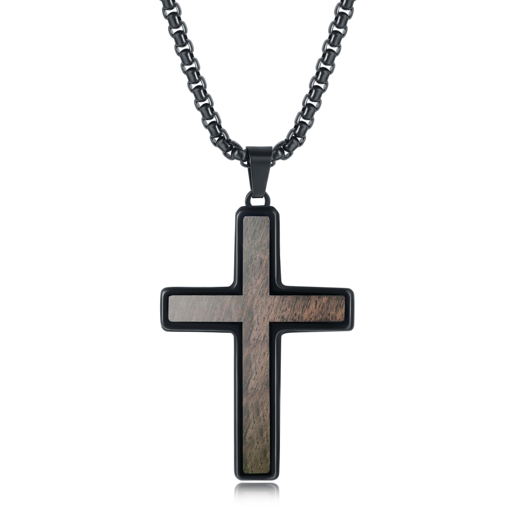 Ropartman Wood Cross Necklace for Men, Hand Inlaid Real Ebony Black Stainless Steel Christian Wooden Crucifix Pendant for Boys, Free Necklace 24" Box Chain (Black)