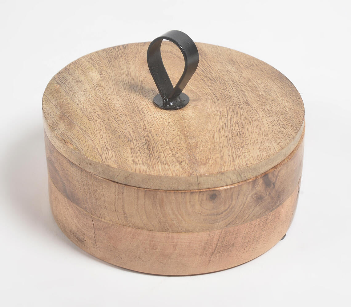 Q Bazaar brings to you this eco-friendly, earthy round jewelry box made from solid wood by artisans from North India. With a classic design and a light burnt finish, this box is ideal to store small jewelry and trinkets. Handcrafted woodwork employs the use of sharp tools like chisels to create highly detailed designs and fine inscriptions on wood by hand. This distinguishing feature results in unique offerings that are hard to replicate. This art form is widely practiced in India and involves long hours of manual labor and precision