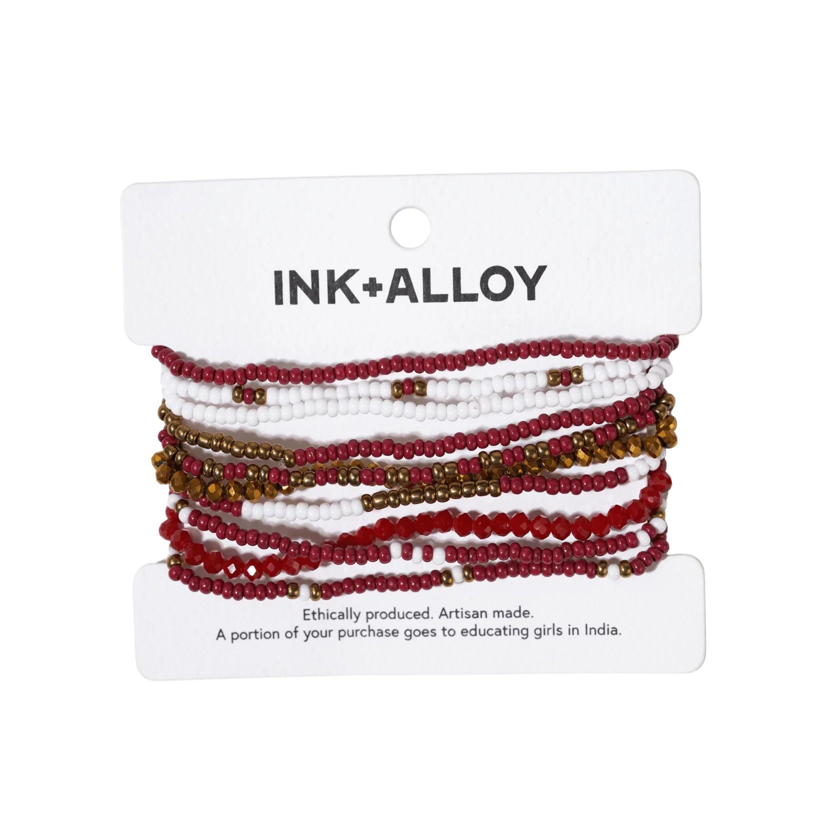 Sage color block beaded 10 strand stretch bracelets gold + dark red