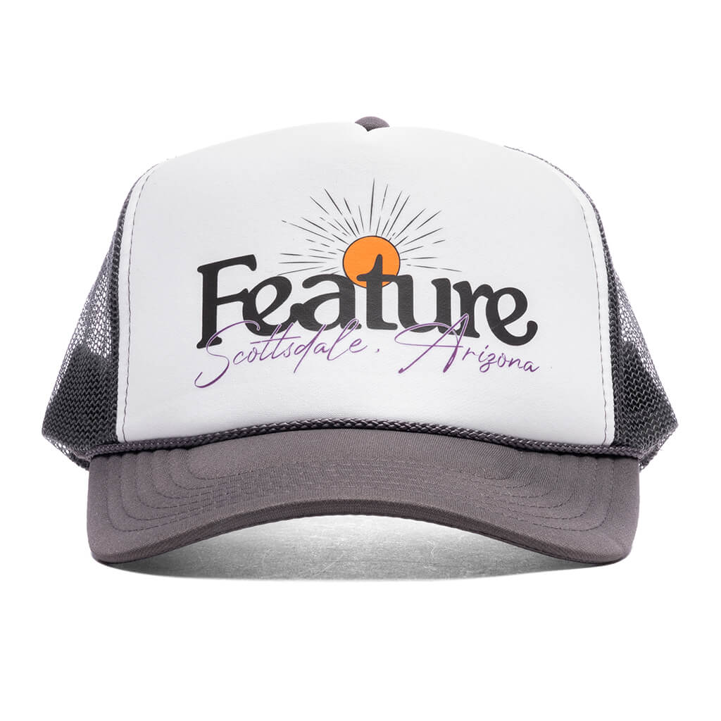 The Scottsdale Cactus Trucker features a polyester foam front with a curved brim, enhanced by mesh quarter paneling for breathability. The design includes an adjustable rear snapback closure and a screen-printed logo graphic at the front, completing its stylish look.