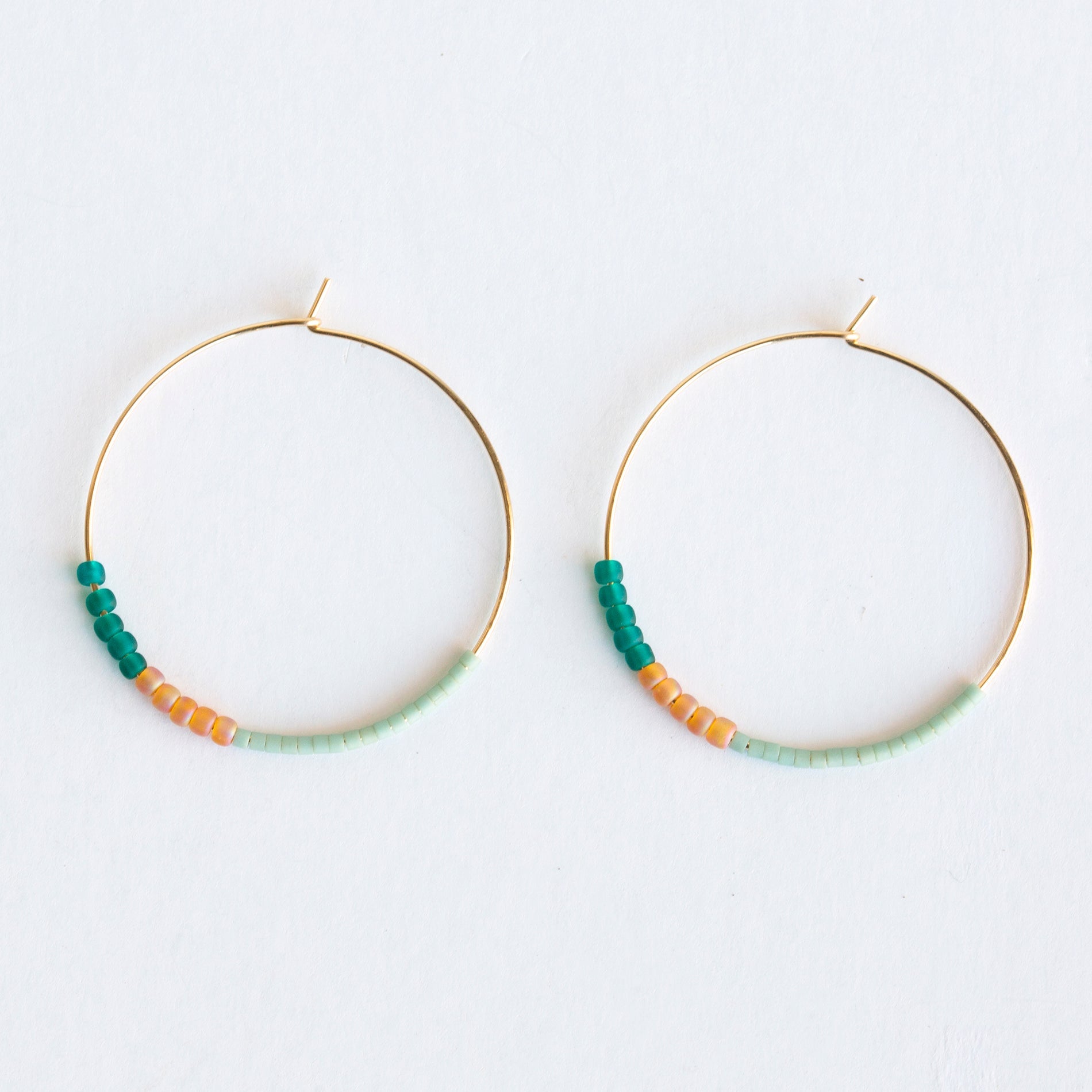 These understated 14k gold-filled hoop earrings are adorned with a selection of Dusk patterned precious beads in striking color combinations.