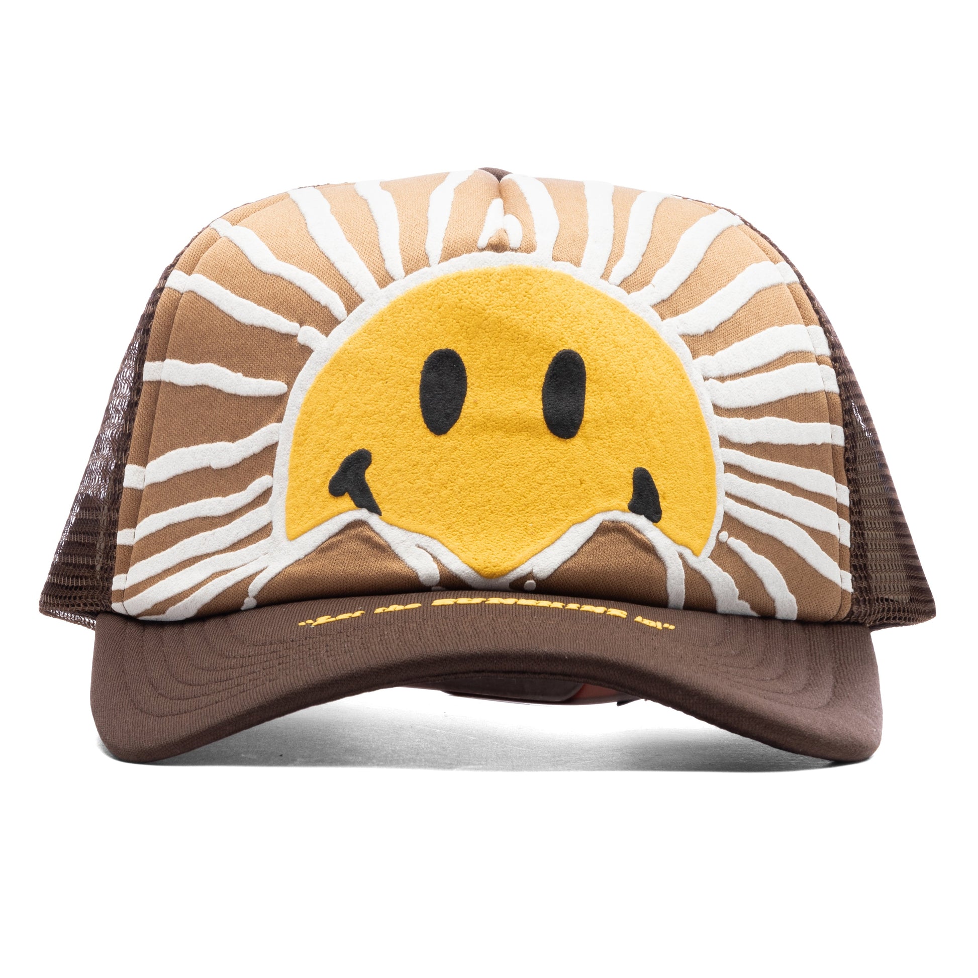 Taking on a cotton construction, the Smiley Sunrise Trucker Hat makes an impression with its unique aesthetic. The cotton-cut hat features a curved brim paired with an adjustable rear closure. An embroidered print graphic resides at the front and rear for a finishing touch.