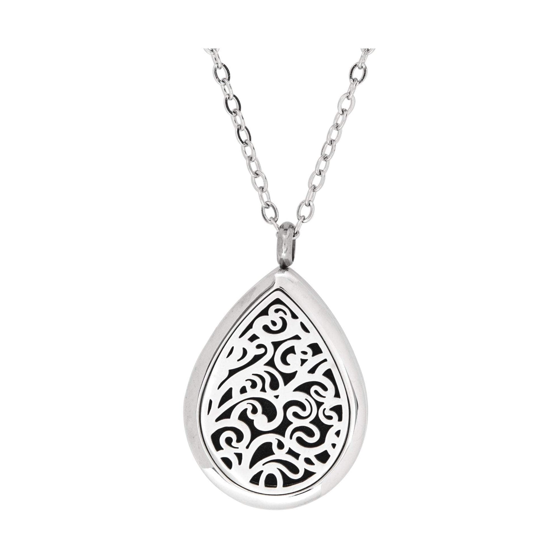 Enhance your retail clients’ overall well-being with the Serina and Company Stainless Steel Swirl Tear Drop Pendant. When an essential oil is applied to the wool pad inside, scent is diffused through vents in the locket, allowing clients to enjoy aromatherapeutic benefits any time and place. This beautifully constructed, high quality locket and chain are both made of surgical stainless steel. Chain is 18"L