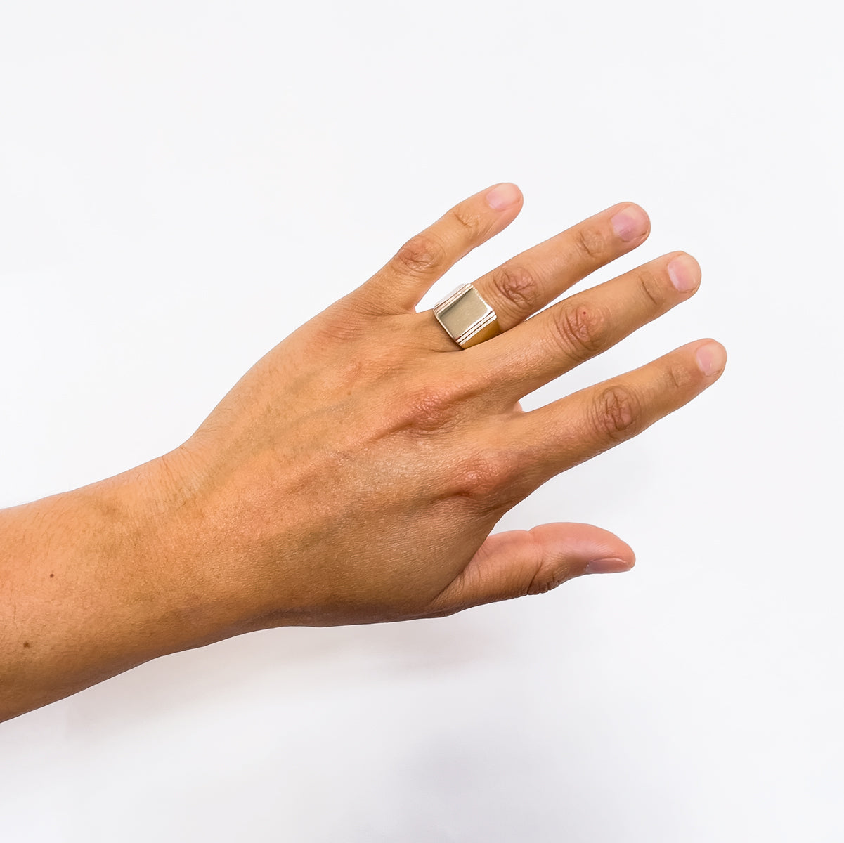 A minimal, deco inspired, solid cast ring with polished top and matte shank. Designed by Betsy & Iya and handcrafted in the studio attached to their Portland shop.