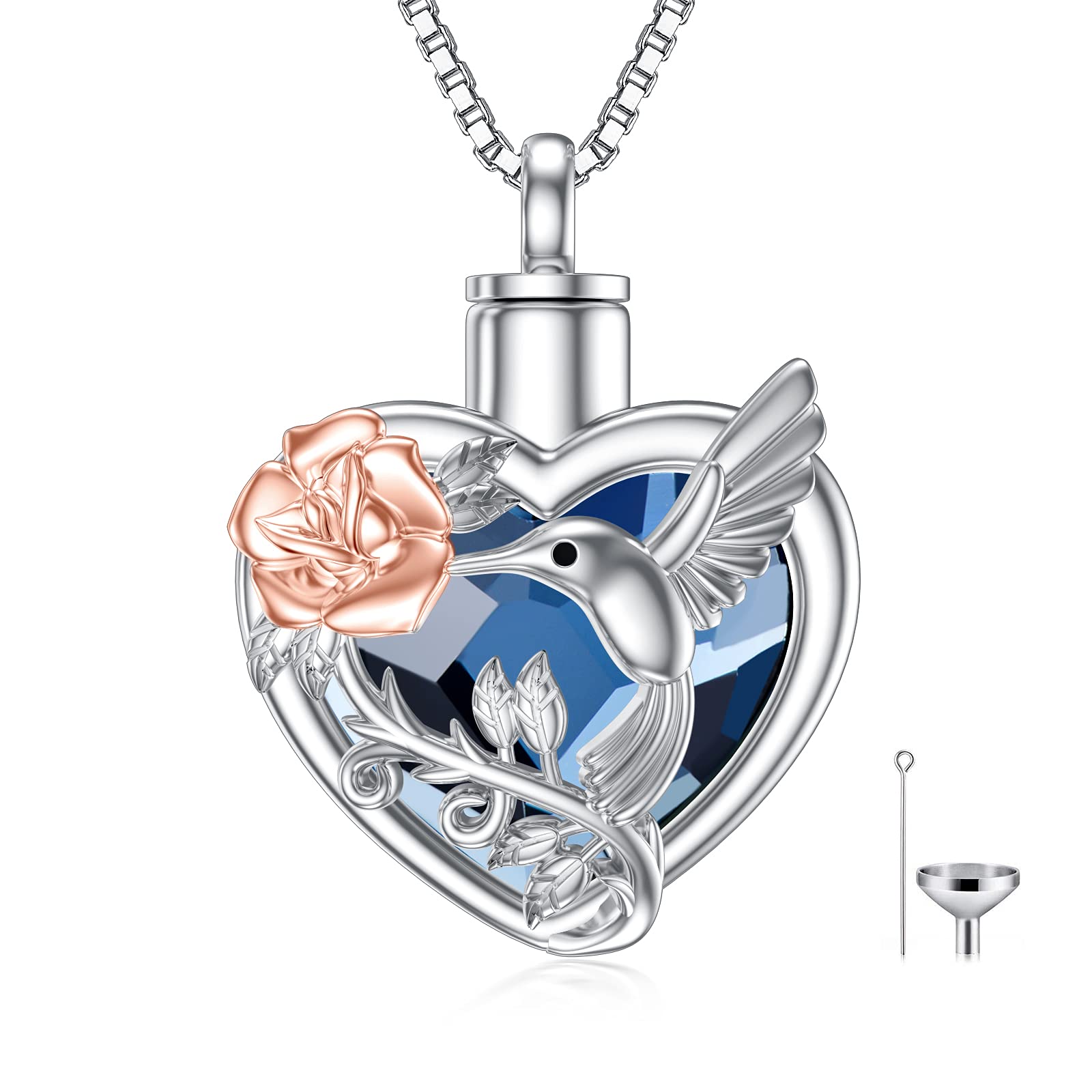 TOUPOP Hummingbird Urn Necklace for Ashes Sterling Silver with Blue Heart Crystal Cremation Jewelry w/Funnel Filler Memory Jewelry for Women Girls