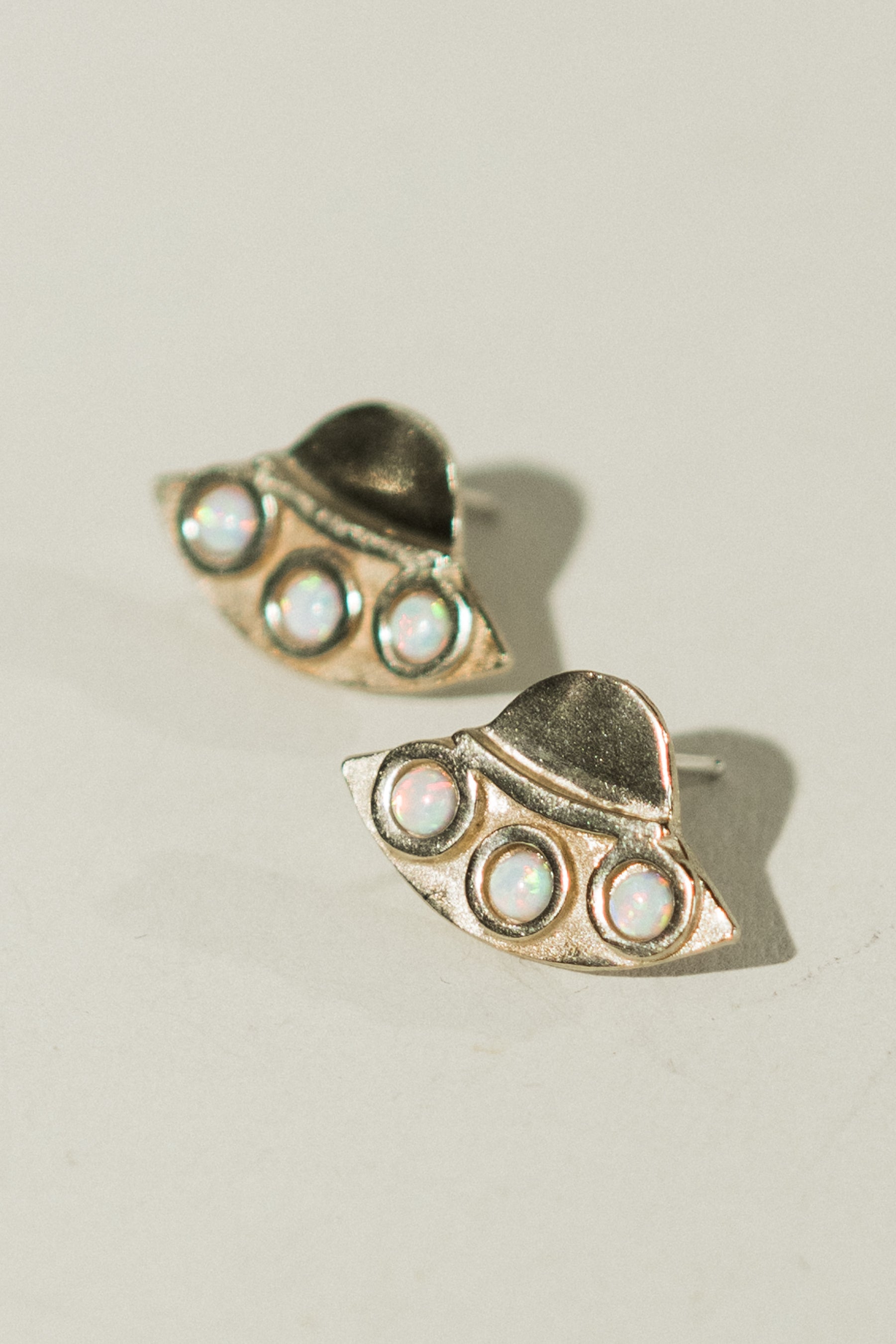 This pair features three 3mm opals on each earring and is made with nickel-free brass and sterling silver posts.