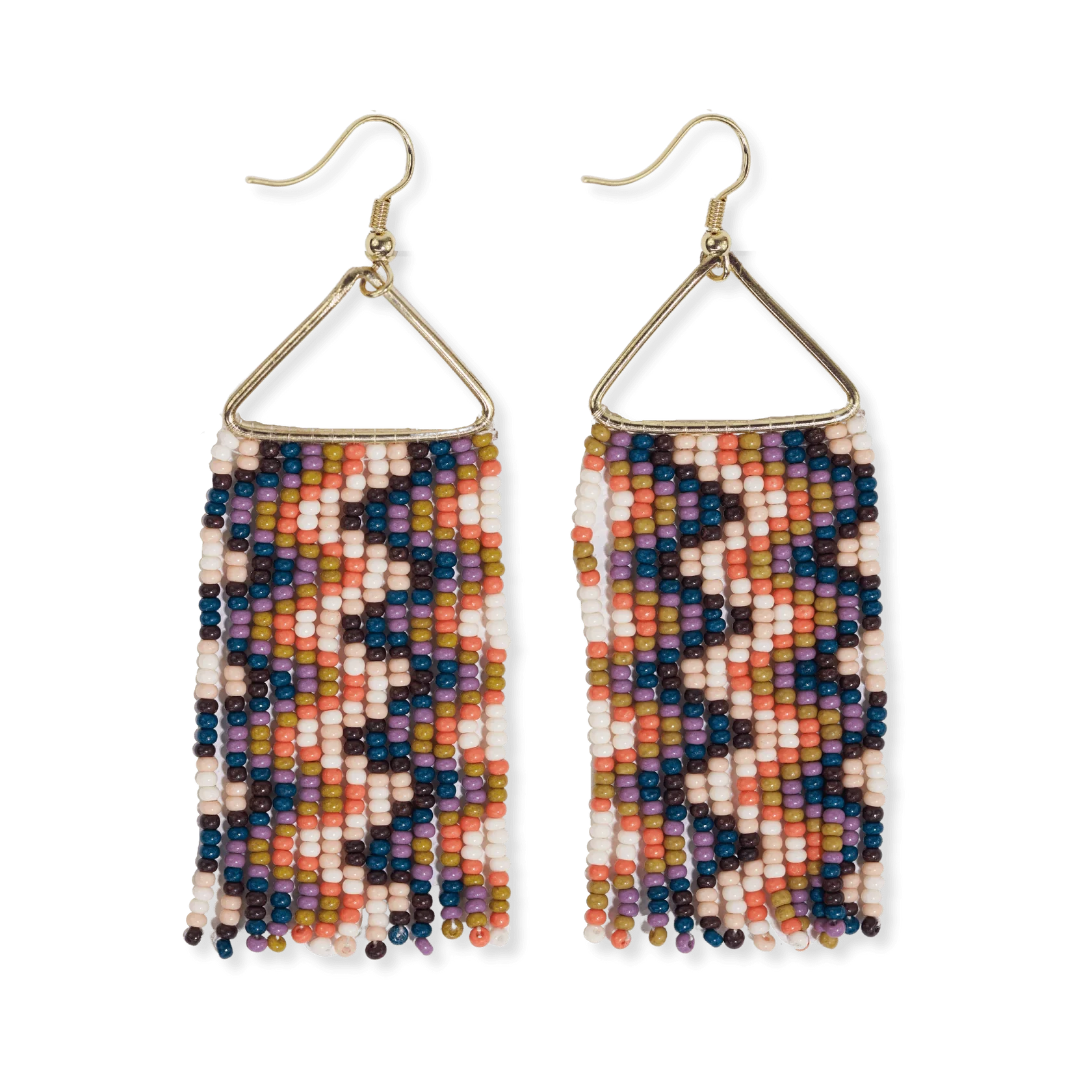 For a groovy and whimsical look, go for the Whitney Wavy Beaded Fringe Earrings in navy, coral, and cream seed beads. These hanger earrings evoke a playful and bold 70's style, perfect for those who love to embrace their free-spirited nature. With their 3.25" length and 1.13" width, these fringe earrings will add a touch of fun and vibrancy to any outfit.
